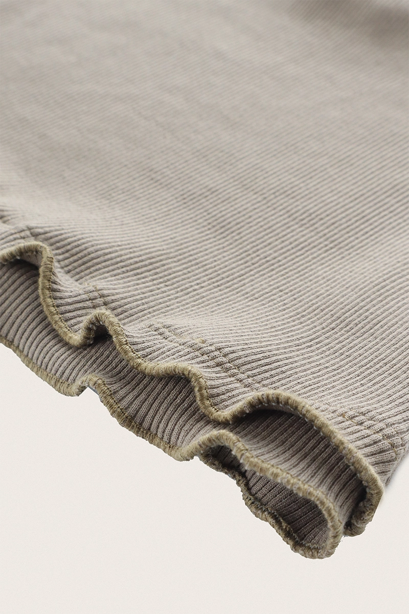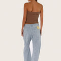 Top Tina marrón strapless de morley elastizado con volados en ruedo y terminación de roulotte. Confeccionado en textil suave y liviano que se adapta al cuerpo. Largo modular a la cintura con acceso directo. Perfecto para un estilo fresco y moderno.