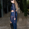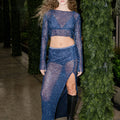 Top Zira azul manga larga de mesh con canutillos a tono, translucido. Largo modular por debajo del busto, fit regular. Tela de peso liviano. Avio marcario chapita de metal sofia en espalda.