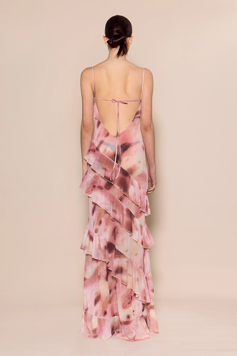 Vestido Atelier por Clara Pinto largo de mesh full print en tonos rosas y amarillos, con volados caracol en delantero y espalda. Tela simple, translucida, suave al tacto y con caída.