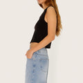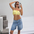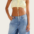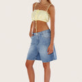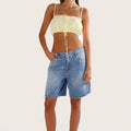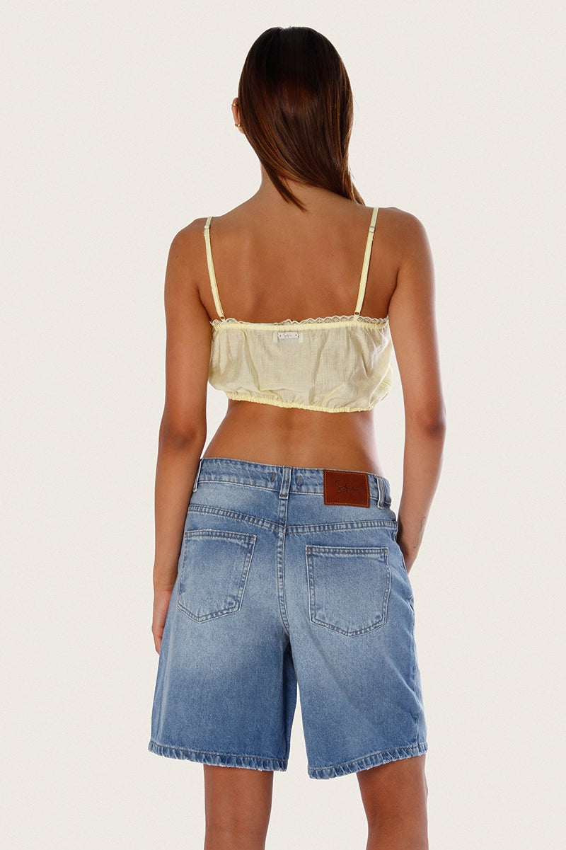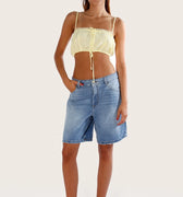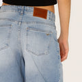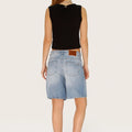 Bermuda Grou celeste confeccionada en denim 100% algodón. Su diseño incluye avíos en color níquel y badana de cuero en tono suela como detalle distintivo. De tiro medio y largo modular por encima de las rodillas, ofrece un calce cómodo y actual. Una prenda versátil que se adapta a tus looks.