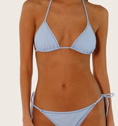 Bikini Zud celeste en tricot mate con tela lisa. Corpiño triangulito movible y colaless, ambas piezas para atar y ajustar a tu medida. Presenta pespunte zig zag en los contornos a contratono de la tela base, lo que aporta un detalle distintivo. Lleva chapita metálica con el logo Sofía Sarkany que completa el diseño.
