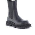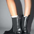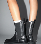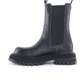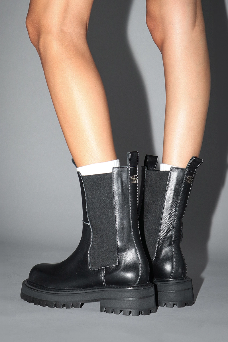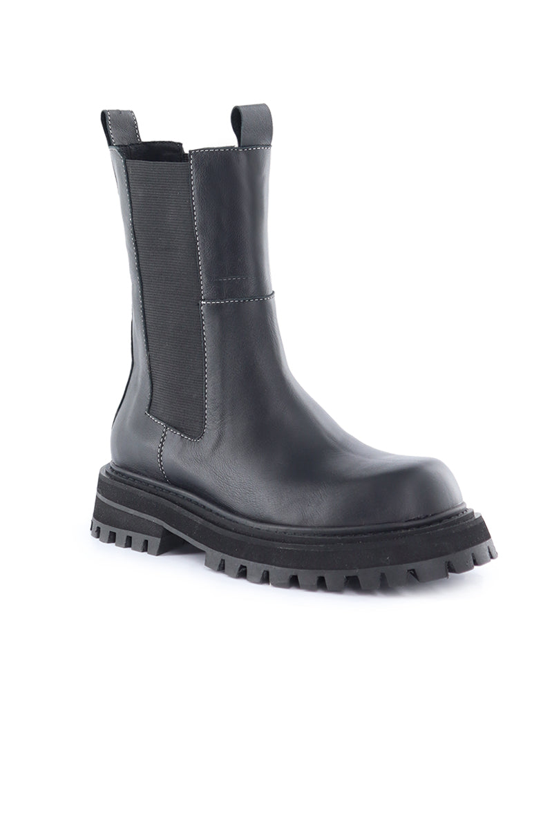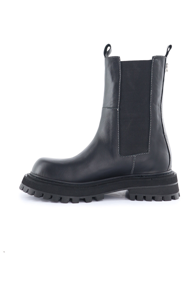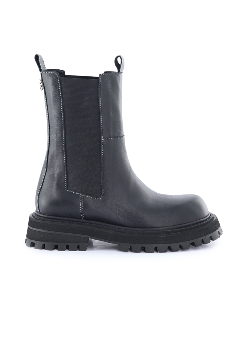 Bota chelsea Inte negra de cuero negro con elástico y costuras a contratono. Aplique marcario en color níquel. Forrería de fibras animal friendly. Fondo artesanal altura 4 cm. Altura de caña 21,5 cm.