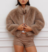 Campera Pali visón de pelo con cuello alto. Fit oversize y largo por cadera. Cierre en centro delantero y badana de cuero con logo en espalda a tono de la base.