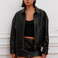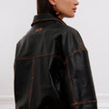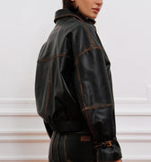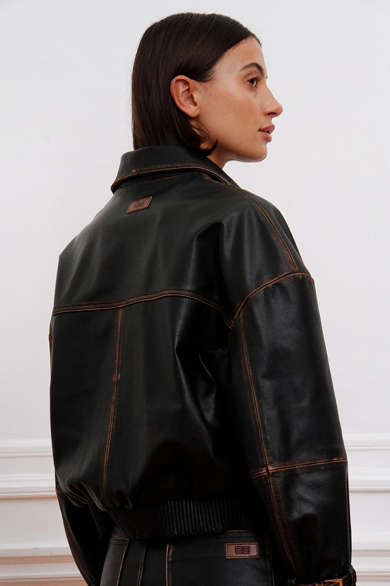 Campera Traf color negro confeccionada en cuero gastado. Su diseño presenta cinturones en los puños de manga y cintura fruncida en la espalda, aportando estructura al modelo. Fit oversize y largo por primera cadera para un calce relajado. Incluye tiracierre níquel personalizado y badana de cuero gastada con logo 3D a tono con la base. Una campera con carácter que eleva cualquier look.