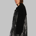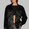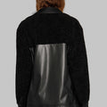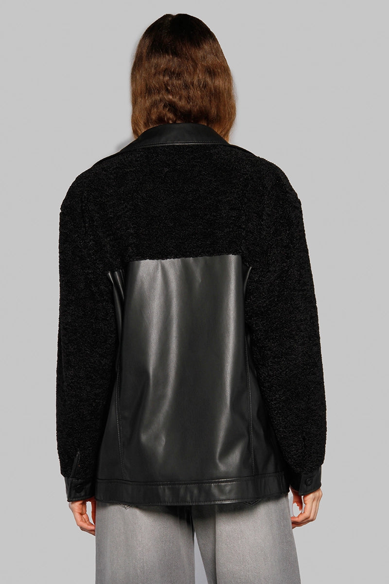 Campera Ucles negra de cuero sintético con recorte en canesú delantero y trasero con combinación de tejido pelo bluclé sintético.