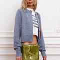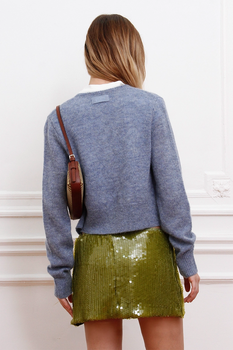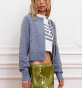 Cardigan Lily celeste tejido de hilado mezcla. Slim fit y largo por cintura. Botones personalizados x7 a tono de la base y etiqueta tejida con logo marcario.