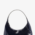 Cartera en forma de medialuna. Confeccionada en charol azul. Sofia grabado a fuego en frente. Bolsillo interno. Medidas: Alto 15 CM, ancho de 40 CM, profundidad 17 CM. Correa largo total 40 CM.