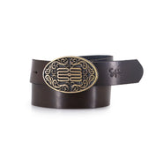 Cinturón Coun chocolate de cuero con hebilla ovalada tipo " cowboy" personalizada con logo nuevo de la marca.