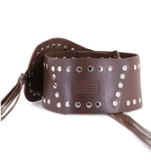 Faja Eris chocolate de cuero 100%  con tachas niquel en todos sus bordes. El talle S tiene un largo total de 68cm y el talle M tiene un largo total de 80cm. El ancho de ambas es de 8cm. Tiene tientos de cuero que permiten ajustarla a la medida deseada de un largo de 66cm. El logo sofia esta grabado a fuego en la delantera del lado derecho. La modelo esta usando talle S.