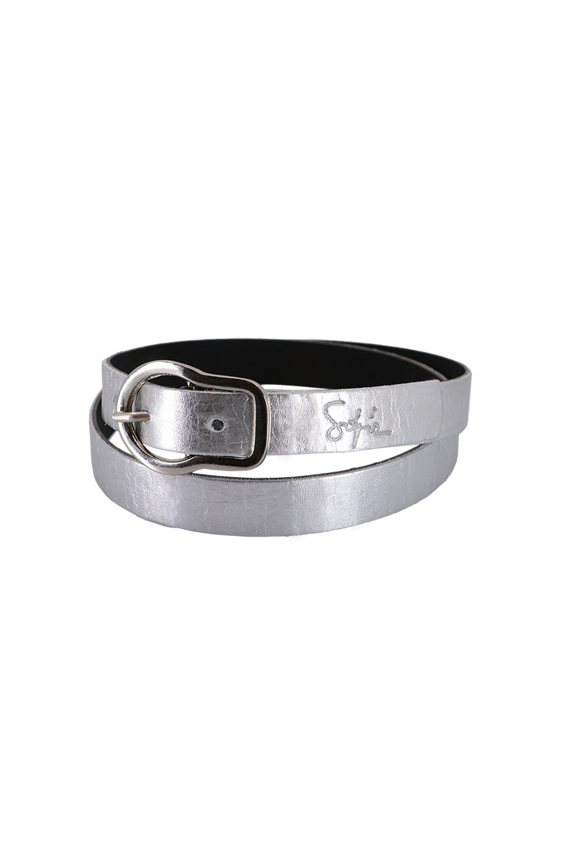 Cinturón Onis color plata de cuero, ancho 2 cm, con hebilla niquel y logo Sofia grabado.