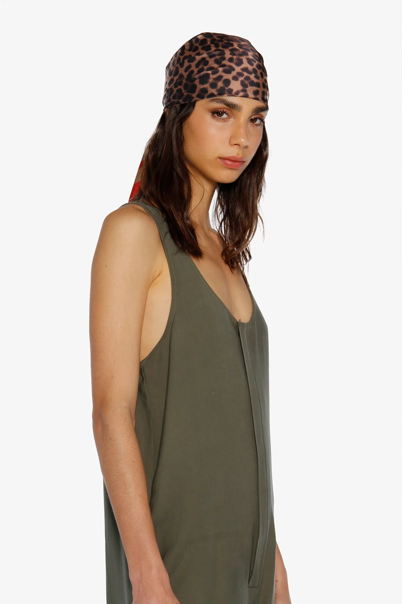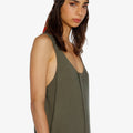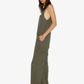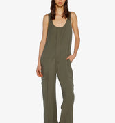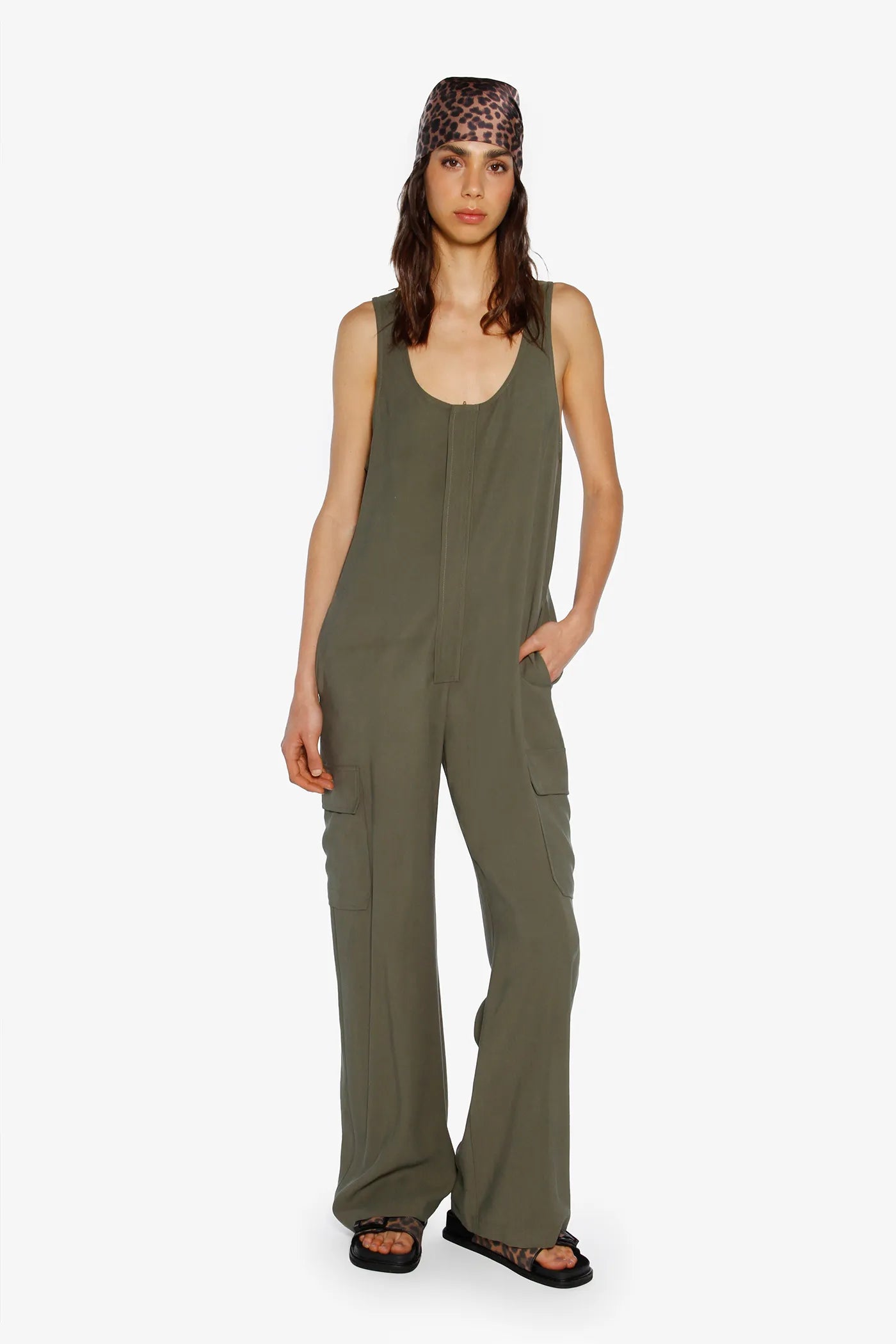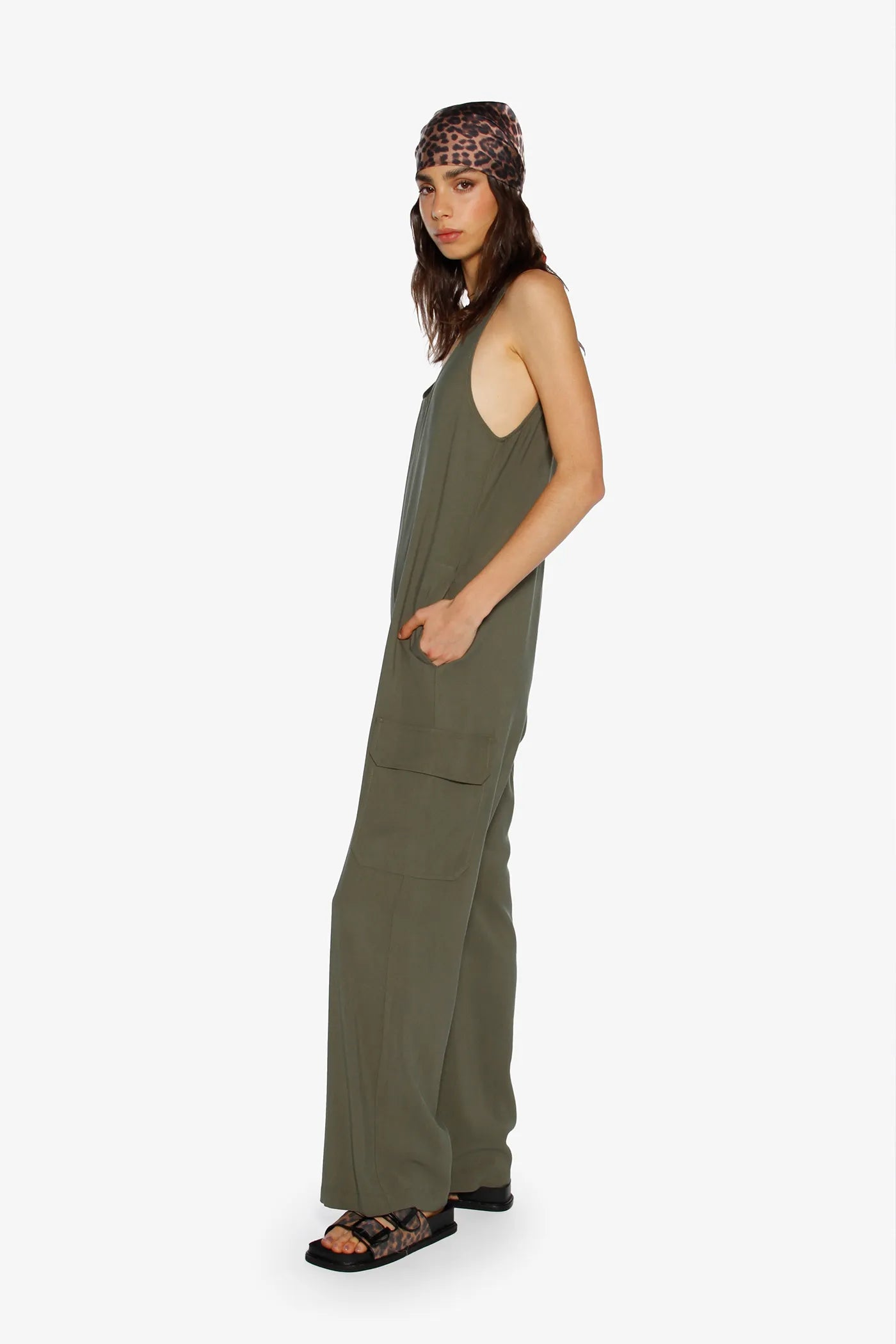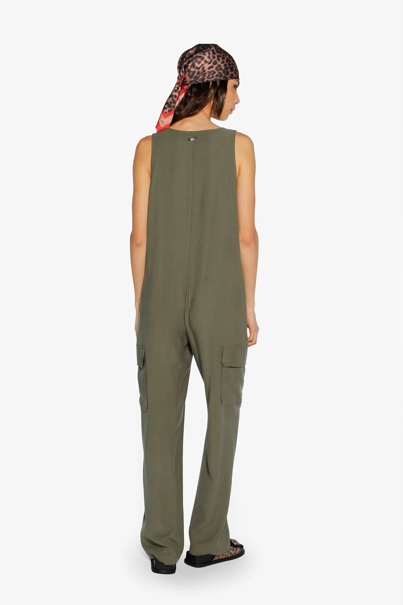 Mono musculosa con pantalón cargo. Cierre interno en la delantera. Chapita metal con logo Sofiía en espalda. Tela plana con caída y peso liviano. Su largo modular es hasta talones.