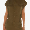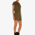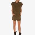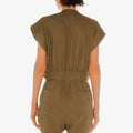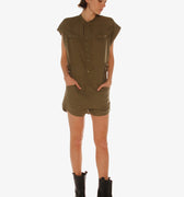 Mono corto de lino con botones snaps personalizados. Es amplio en su totalidad y su largo modular es por la mitad del cuádriceps.