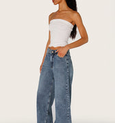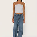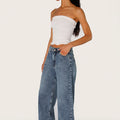Pantalón de jean amplio Rag azul con tiro medio y tejido de rigidez media. Tiene un ruedo ancho rebatido y atracado para mayor comodidad, aportando un estilo relajado y versátil. Para un calce de tiro bajo, se recomienda elegir un talle más.