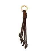 Llavero Sha chocolate con tientos de cuero gamuzado y terminales personalizadas en punteras. Mosquetón a tono de terminales.