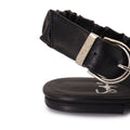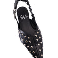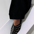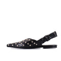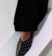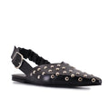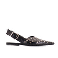 Slipper de cuero Atta negra en punta con tachas bombé, complementada por una tira forrada con elástico y hebilla en el talón. Cuenta con forrería de fibras animal friendly y suela de goma, para un estilo moderno