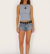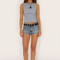 Musculosa Fini celeste confeccionada en tela elastizada con textura y cuello bote. Presenta una chapita metálica Sofía como detalle marcario en la prenda. Su textil es suave, liviano y cómodo al uso, con largo modular por debajo de la cintura. Una prenda ligera que resuelve cualquier look con frescura.