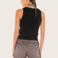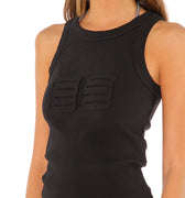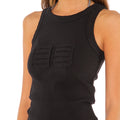Musculosa Lior negro confeccionada en morley elastizado con collareta a tono de 2 cm en cuello y sisas. Presenta el logo de la marca en la delantera, realizado con técnica de tela atrapada como detalle distintivo. Su textil es liviano y se adapta a la silueta del cuerpo, con largo modular por encima de la cadera.