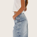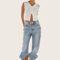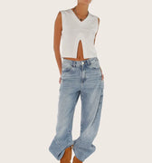 Musculosa Soux blanco confeccionada en jersey con escote en V que presenta un pico central y recorte en la zona del busto. Incluye logo bordado a tono en la delantera como detalle sutil de marca. Su textil de peso medio aporta estructura, con largo modular por debajo de la cintura.