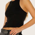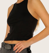 Musculosa Tonn negro de jersey elastizado con sisa cavada y cuello base. Presenta collareta fina en cuello y sisas, e incluye chapita metálica Sofía en níquel en la espalda como detalle de marca. Su textil liviano aporta confort y frescura, con largo modular por debajo de la cintura. Una prenda que se adapta a distintos estilos.