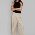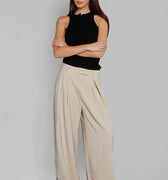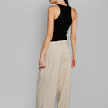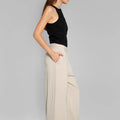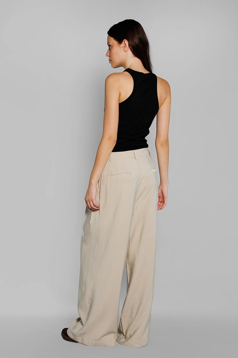 Pantalón sastrero Exo visón de tela rígida, con pierna larga y amplia. Detalle de etiqueta tejida en la pierna derecha y bordado SS a tono en la espalda, aportando un toque de identidad y exclusividad.