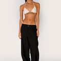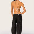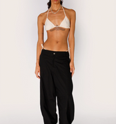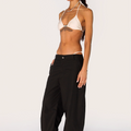 Pantalón de poplin Plur negro con cintura sastrera con botón. Tiene bolsillos cargo en laterales y jareta de ajuste en puños para darle el largo a gusto. Textil de peso liviano. Largo modular total por debajo de tobillos.