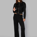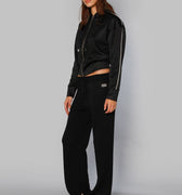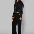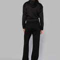 Pantalón tejido Vex negro con tiras de ajuste en la cintura y logo de goma de la marca. Confeccionado en un textil de peso medio con buena caída, su largo modular llega hasta los talones. Ideal para un look cómodo y elegante.