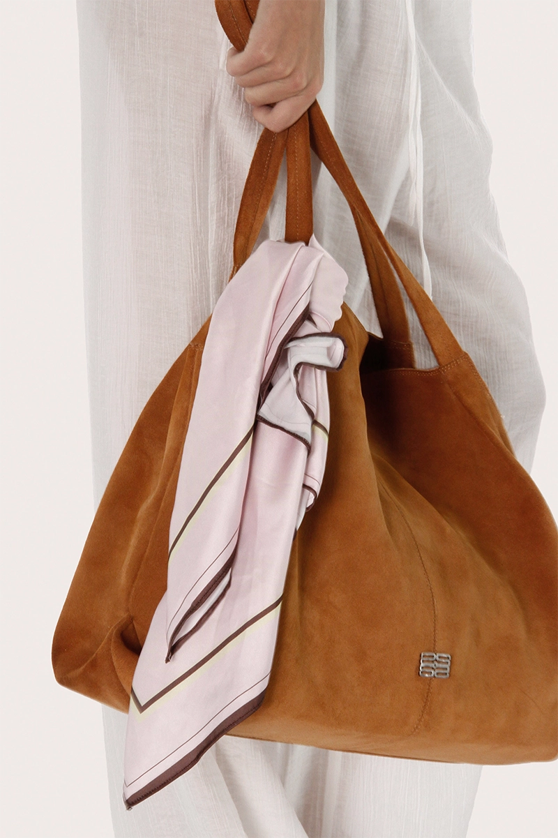 Pañuelo Miak rosa confeccionado en seda suave al tacto con estampa personalizada de la marca. Su diseño cuadrado de 70 x 70 cm permite múltiples usos, ya sea como accesorio de cuello, en el cabello o sobre una cartera. Un complemento distintivo que suma color y estilo a cualquier look.