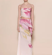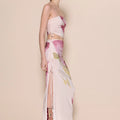 Pollera Atelier por Clara Pinto. Cintura irregular, jareta en lateral para fruncir. Tajo en delantera. Estampa única en lateral en tonos rosas. Tela suave al tacto y ajusta a la silueta. Largo modular por talones.