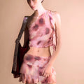 Pollera Pale Atelier por Clara Pinto con tres volados caracol que se superponen y dan volúmen. Cintura con elástico y delantero y espalda en tela doble para que sea levemente translucida. Tela estampada full print en tonos rosados y amarillos. Largo modular por debajo de la cola. Tela suave al tacto y ajusta a la silueta en cadera.