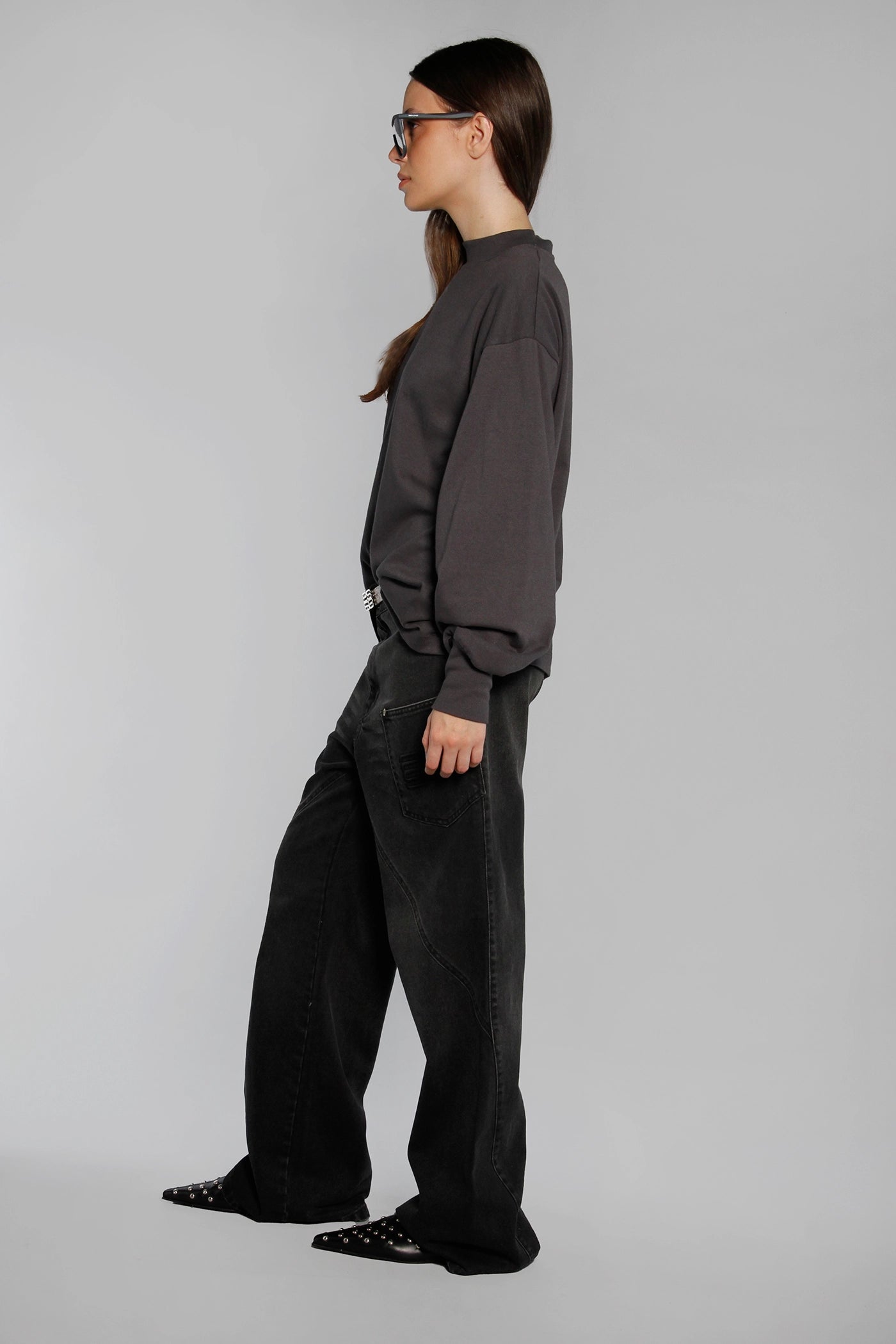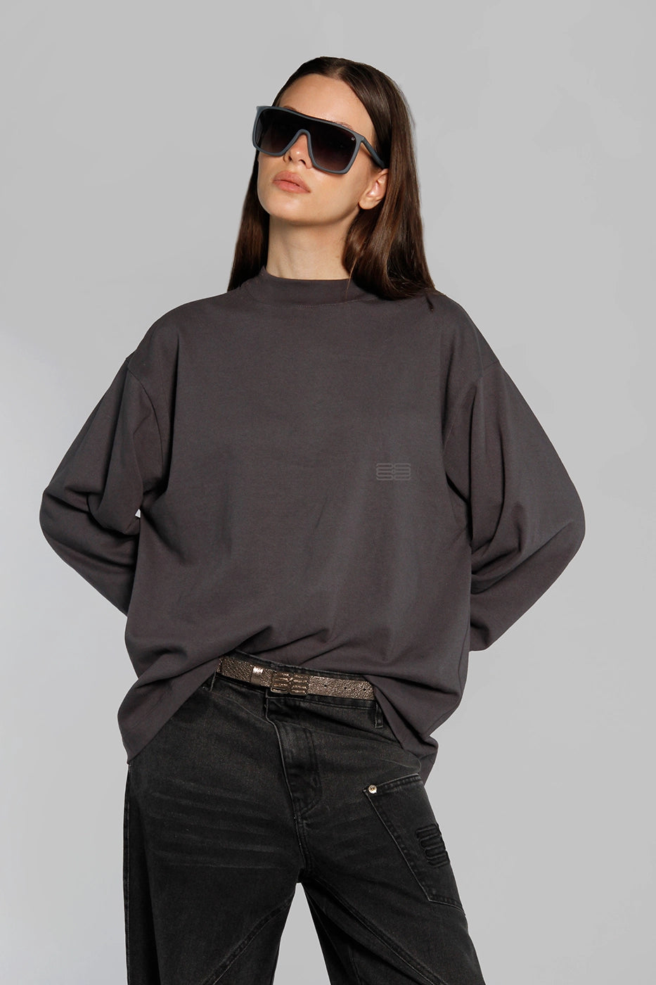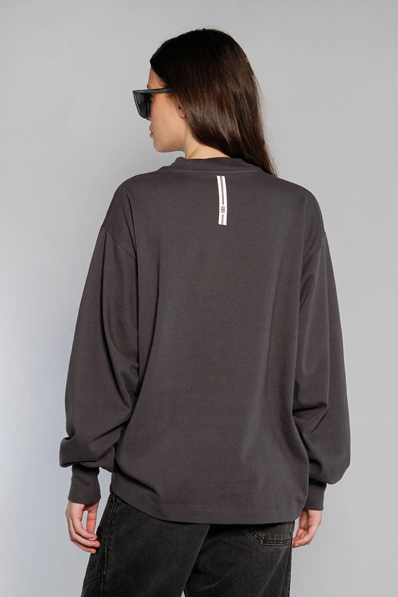Remera oversized Jax gris de manga larga con frunce. Confeccionada en tela de peso medio con caída fluida. Su largo modular llega por debajo de la cadera. Diseño con logo bordado en el frente.