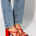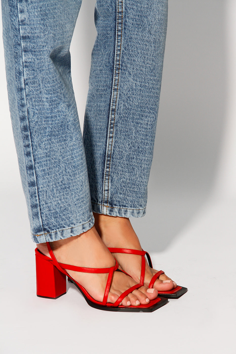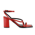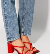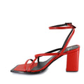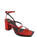 Sandalia de cuero con plantilla cuadrada. Forrería de Fibras Animal Friendly. Capellada simple con tiras cruzadas en empeine y hebilla en talón. Suelín con vira y taco de 7 cm.