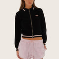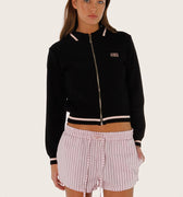 Short Mew de poplin color de base rosa con un rayado a contratono. Cintura con elástico y jaretas para ajustar. Tiene una etiqueta centrada en la cintura delantera como avio marcario. Bolsillos en costura. Tela de. peso liviano y largo modular por debajo de la cola. La modelo esta usando talle S