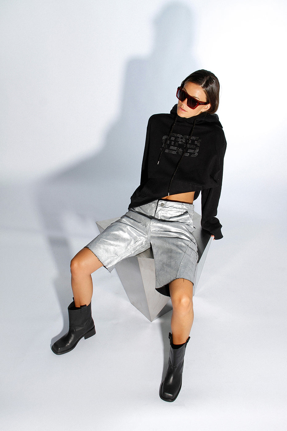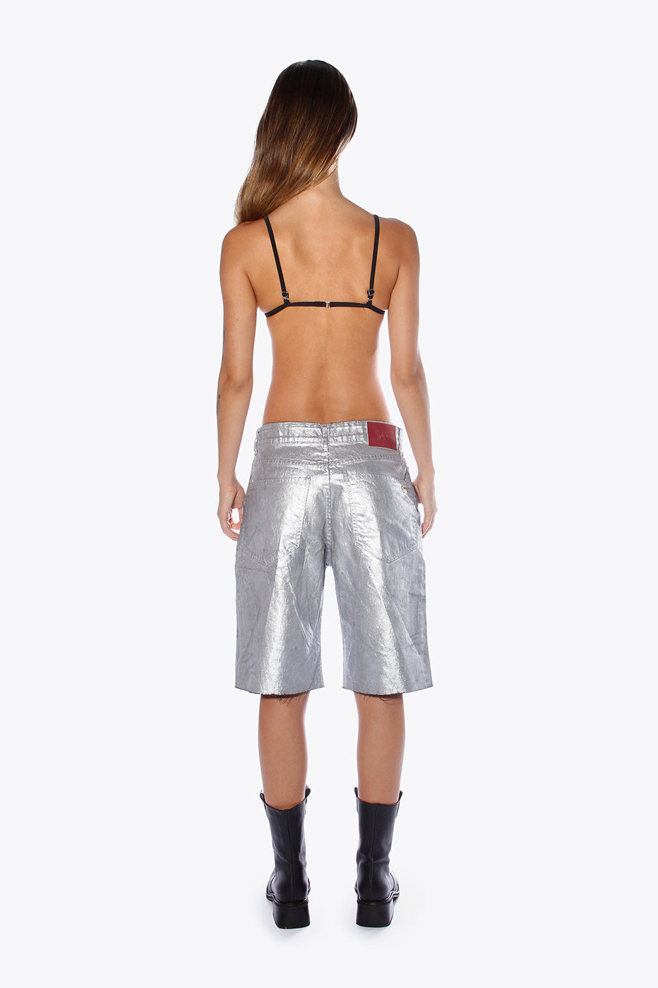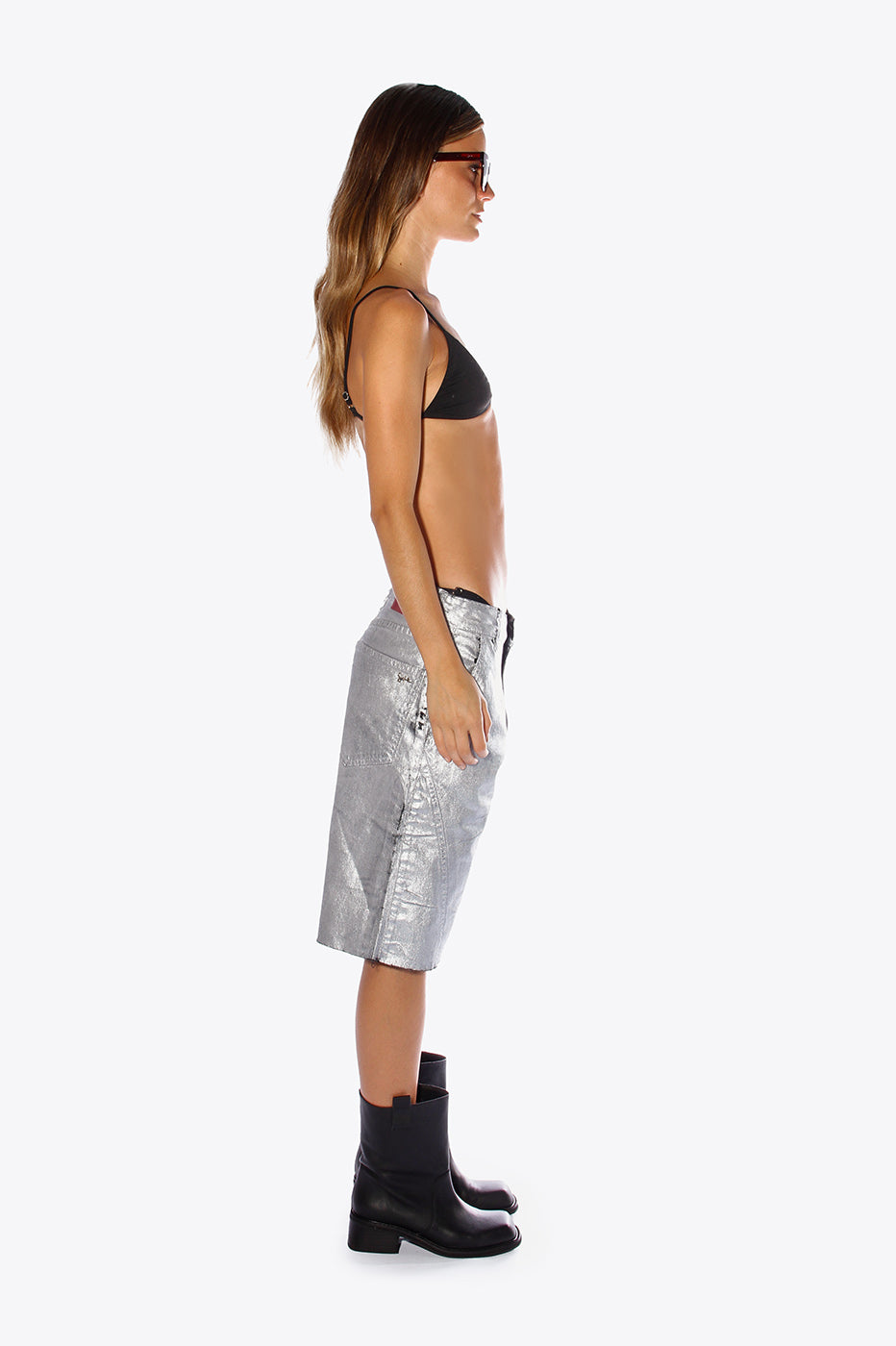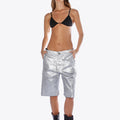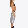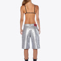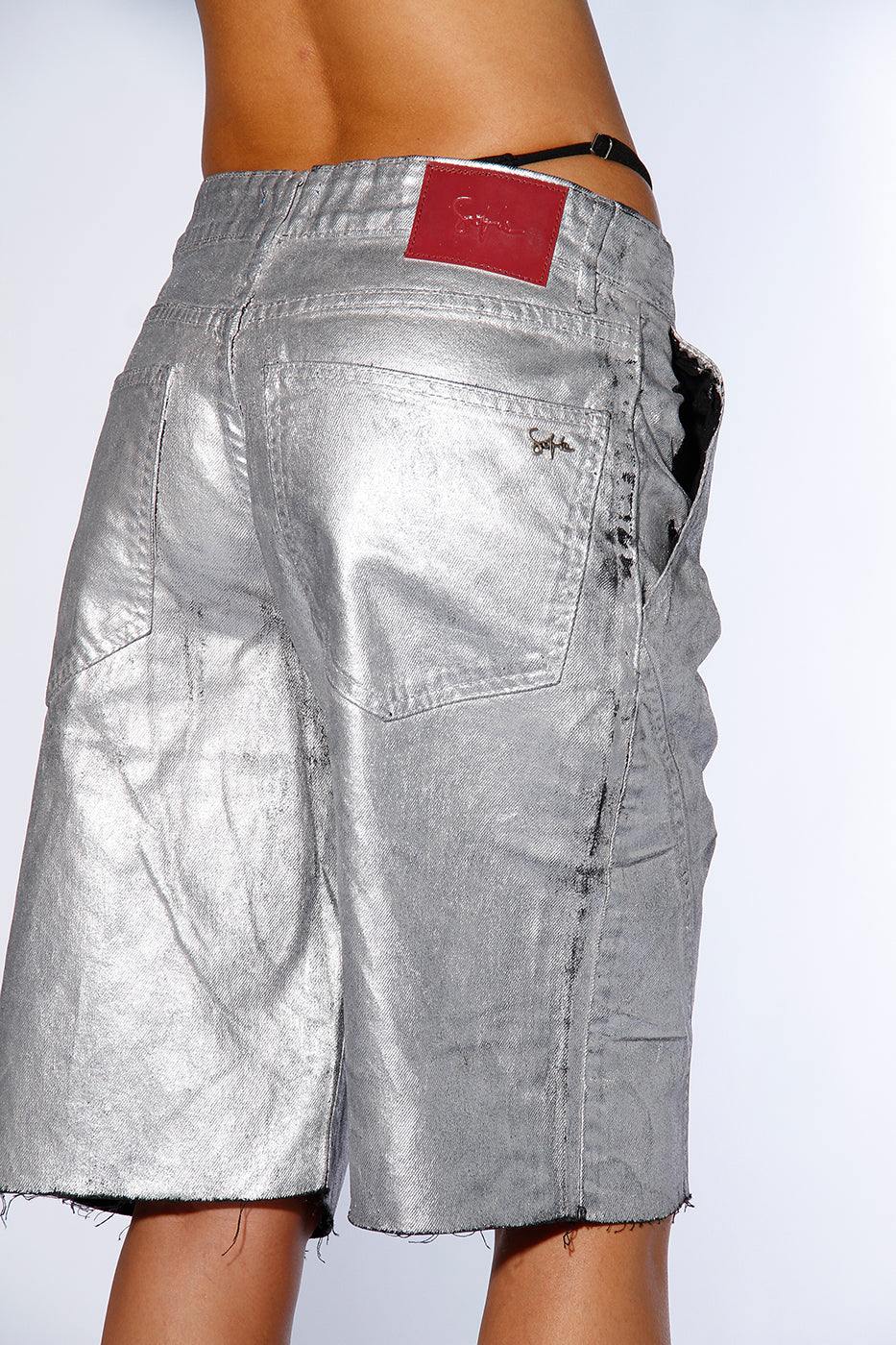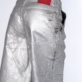 Bermuda de jean rígido con acabado de pintura en toda la prenda color plata. Ancho de piernas amplio. Largo por las rodillas. Terminación de ruedo al corte.