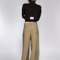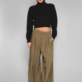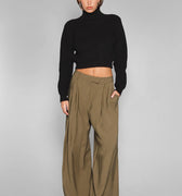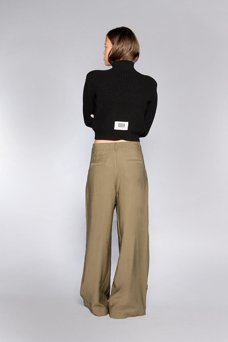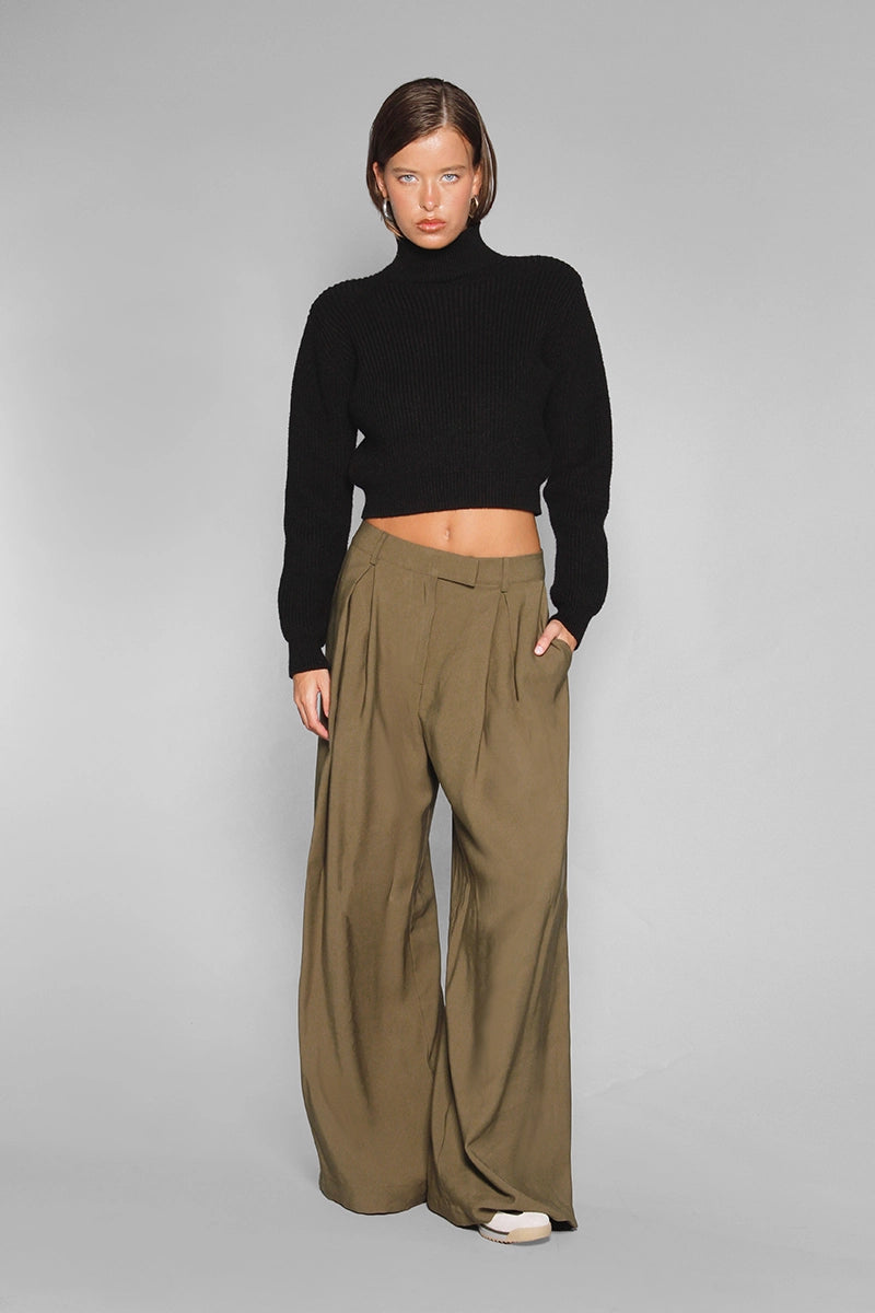 Sweater Buf negro con hombreras y cuello polera. Está confeccionado en tejido de peso medio. Su largo modular llega por arriba de la cintura. Cuenta con detalle de etiqueta con el logo de la marca en la espalda.