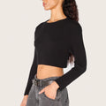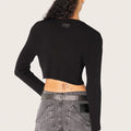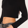 Sweater Crol negro de morley crop, confeccionado en tejido liviano y suave al tacto para mayor confort. Su diseño de ruedos al corte y largo modular hasta la cintura es ideal para looks modernos y versátiles.