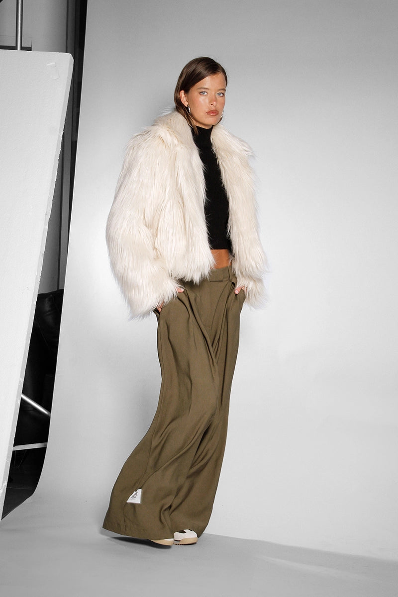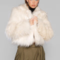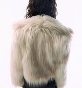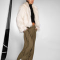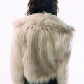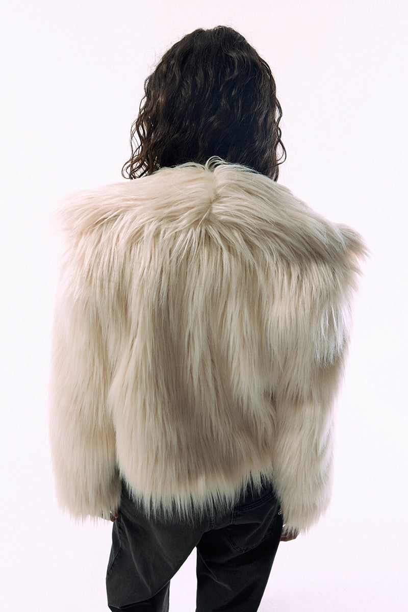 Tapado Ragi blanco de pelo largo, con un largo modular que llega hasta la cadera y confeccionado en un textil de peso medio, combina elegancia y comodidad.