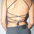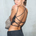 Top Ceje negro de encaje translúcido con tiras ajustables en la espalda y detalle de cintas oscuras en el delantero para mayor comodidad. Está confeccionado en tela liviana y su largo modular llega hasta la cintura.