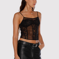 Top Cet negro estilo corset en combinación de mesh y encaje. Su busto doble evita transparencias y los recortes corseteros realzan la figura. Tela elastizada y liviana con acceso directo por la cabeza.