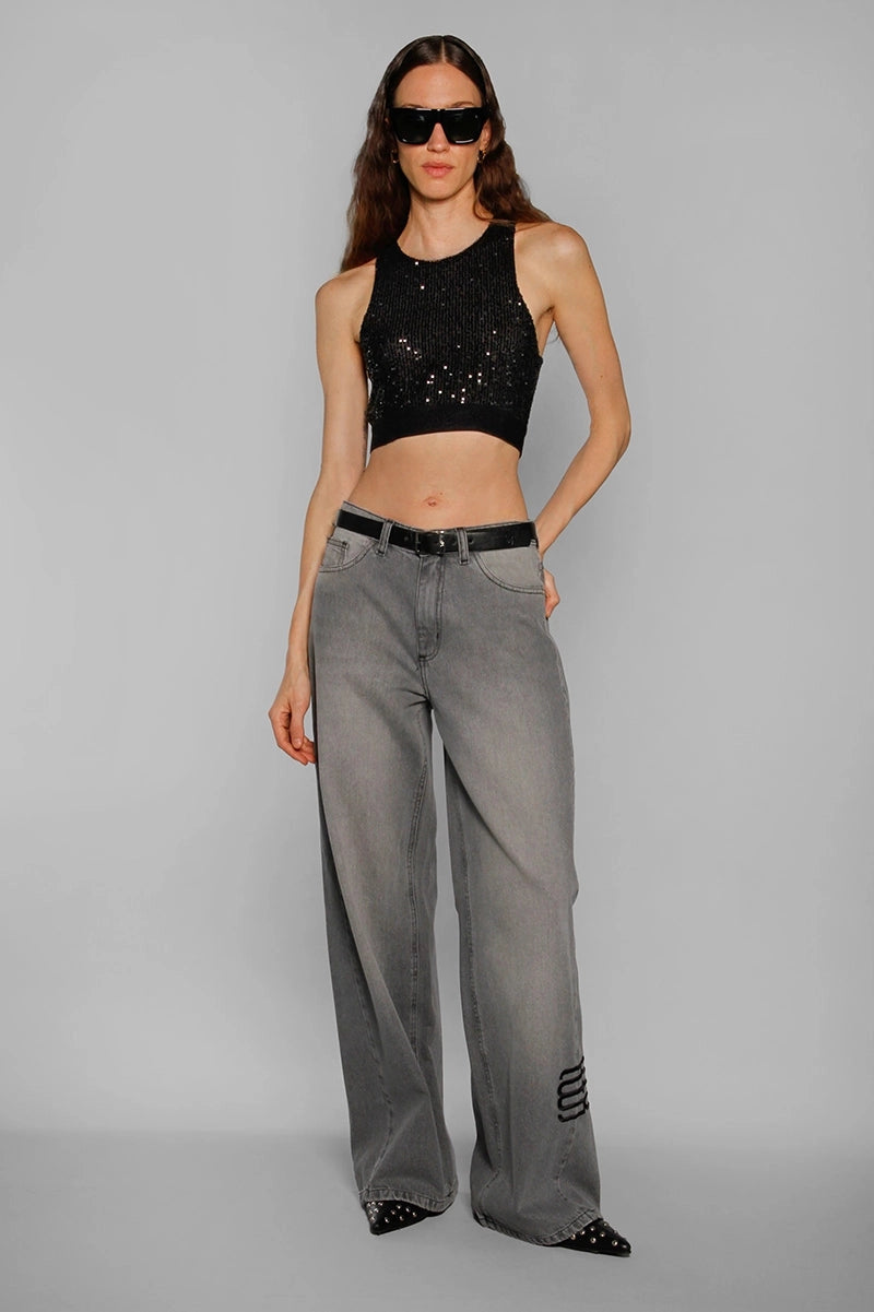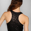 Top kila negro de lentejuelas con forro interno para mayor confort. Está diseñado con cuello a la base y elástico personalizado en la cintura para un ajuste perfecto. Su largo modular llega hasta la cintura. Perfecto para aportar brillo y estilo a cualquier look.