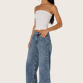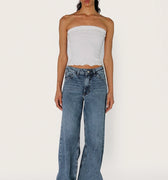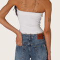 Top Tina blanco strapless de morley elastizado con volados en ruedo y terminación de roulotte. Tela suave y liviana que se adapta al cuerpo. Largo modular a la cintura con acceso directo. Perfecto para un estilo fresco y moderno.