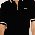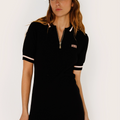 Vestido Biz negro tejido con viscosa elastizada, cuello polo y mangas con rayas a contratono. Acceso con cierre niquel personalizado. Logo bordado a contratono. Largo a la cadera.