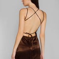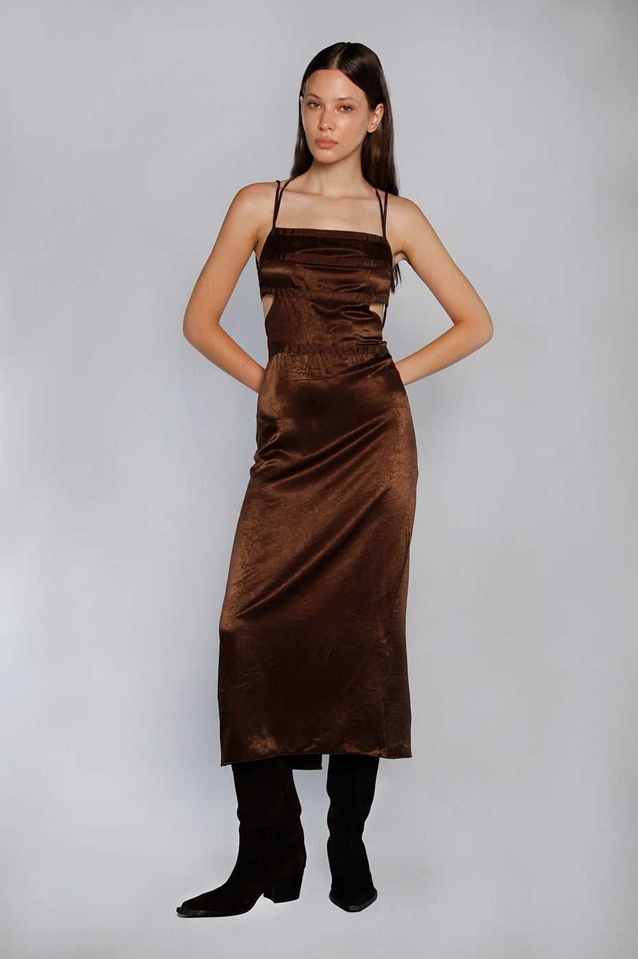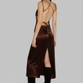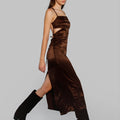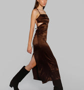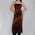 Vestido largo Cigum marrón, con escote recto, cintas y tajo en la espalda. Está confeccionado en un textil fino y con caída. Tiene un largo modular hasta los tobillos y las tiras de la espalda son regulables para un ajuste personalizado. Una opción ideal para eventos especiales.