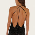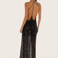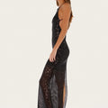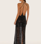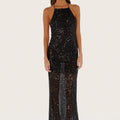 Vestido largo Isti negro confeccionado en lentejuela translúcida con caída fluida. Presenta escote cuadrado y espalda cavada, con breteles finos que aportan delicadeza al diseño. Su textil es liviano y el largo modular llega hasta los talones.