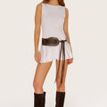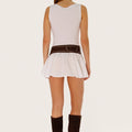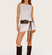 Vestido Kian blanco confeccionado en algodón con falda globo de poplin que aporta vuelo y volumen. Presenta cuello bote y torso en algodón que se ajusta a la silueta, combinando comodidad y diseño. Incluye chapita metálica Sofía en la espalda como detalle de marca. Ambos textiles son livianos y su largo modular queda por debajo de la cola, ideal para un look moderno.