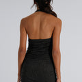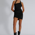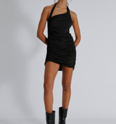 Vestido de microtul con foil y forrería, corto, con frunce en el lateral.