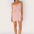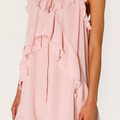 Vestido Wims rosa de seda levemente translúcida, confeccionado en un textil liviano y fresco. Presenta volados en busto y bajo busto que aportan movimiento, mientras que la espalda media y plena mantiene un diseño limpio sin volados. Su silueta es anatómica y el largo modular queda por debajo de la cola. Una propuesta versátil que se adapta a distintos momentos del día.