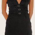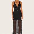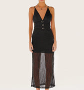 Vestido Yanz negro de encaje translúcido con forrería oscura desde el busto hasta por debajo de la cola. Presenta escote en V y tres cinturones decorativos en el bajo busto que aportan un detalle distintivo. Su espalda baja llega hasta por encima de la cola y cuenta con tajos laterales hasta la rodilla que suman movimiento. Confeccionado en un textil suave y liviano, su largo modular es hasta los tobillos. Un ítem pensado para sumar estilo en cualquier ocasión.